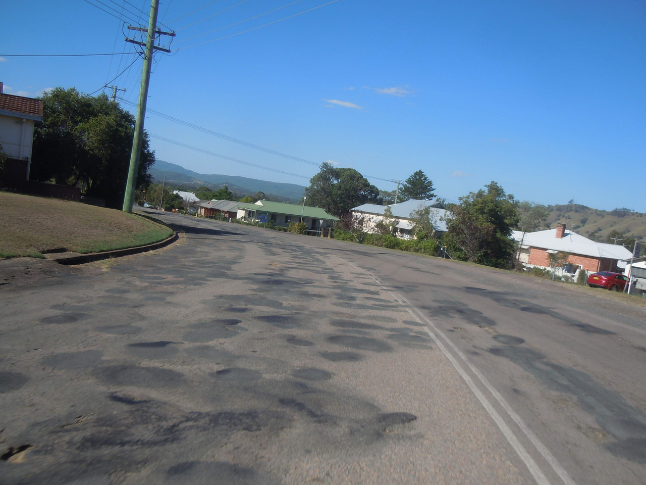 I passed through Dungog again. I don't know what I'll do. It used to be the place with the worst road surface I'd ridden on. Trying to hold the camera and ride was a nightmare. The streets (except for a stretch 100 metres either side of the Council Chambers) all looked like this …