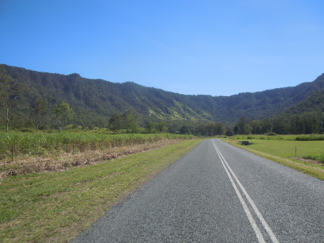 I took no more photos until after we left the Bruce Highway at Mt Ossa and had a great ride along a series of pretty, quiet and enjoyable back roads to the plain below Eungella which was on my list of roads to ride on the way home. It runs up the hill in this picture and is, as promised, very scenic.