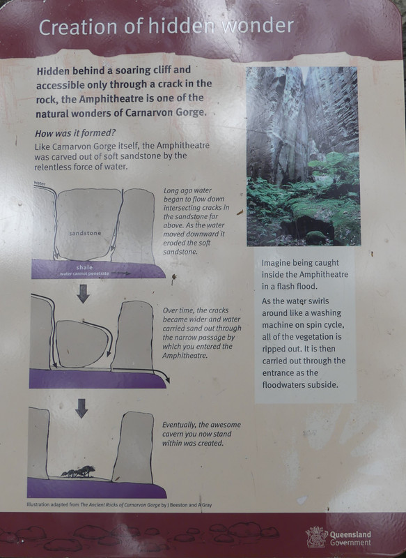 The Amphitheatre was formed by erosion over a long time. A sandstone core has somehow eroded away leaving an amazingly tranquil canyon that can be accessed only though a narrow cut through the rocks. The information sign tells how entertaining it can be during a flash flood.