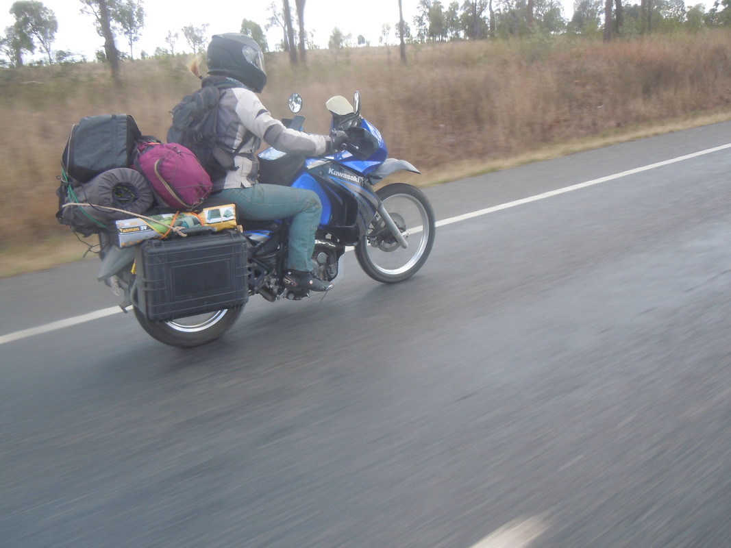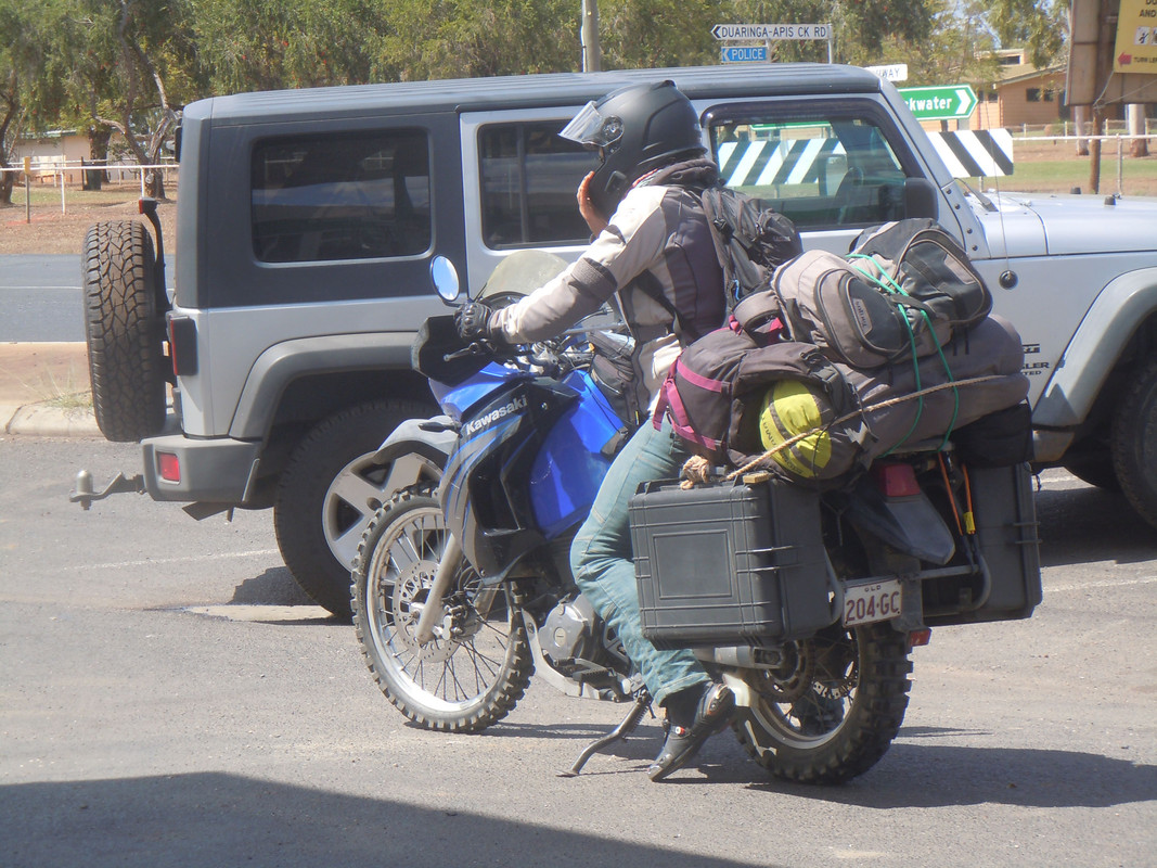 Back in Emerald, I stopped to refuel, get a cup of tea and find somewhere to stay. As I arrived I noticed a person climb aboard a heavily laden Kawasaki KLR650 and ride out of the petrol station.