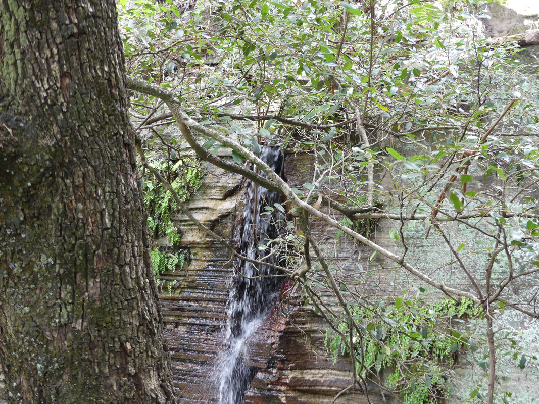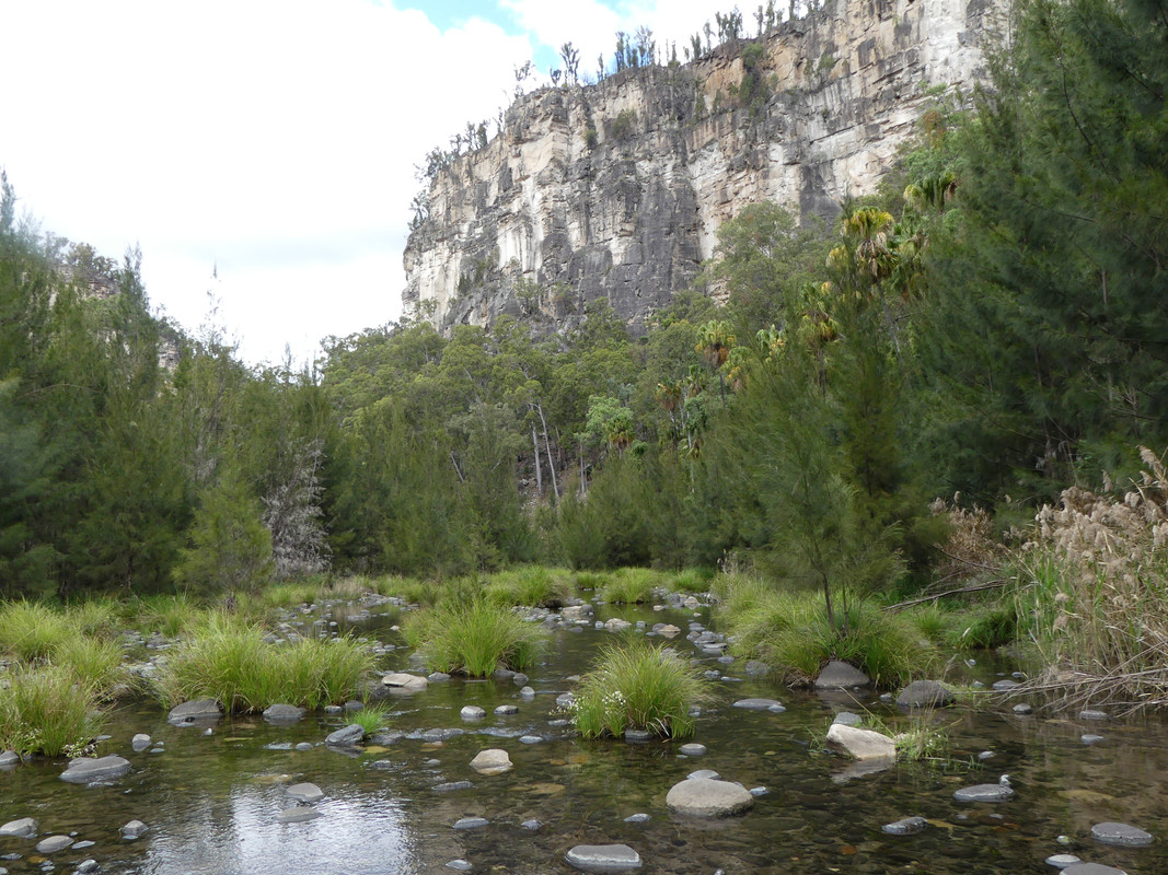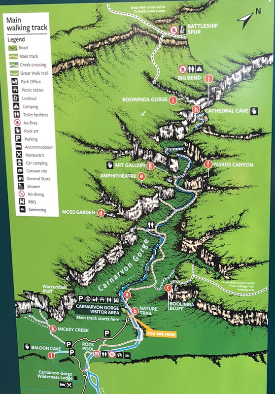 Carnarvon Gorge is what its name says: a valley between two escarpments of around 600 metres high. There's a pretty stream that runs through the valley. When there's serious rain, it becomes a river and is probably uncrossable. The track winds along the valley and there are side-walks to a number of interesting and scenic natural attractions. I figured my general lack of fitness and a dodgy knee meant I'd maybe make it to the second of these and then head back for a rest.