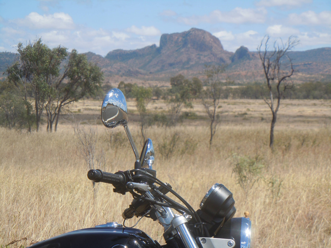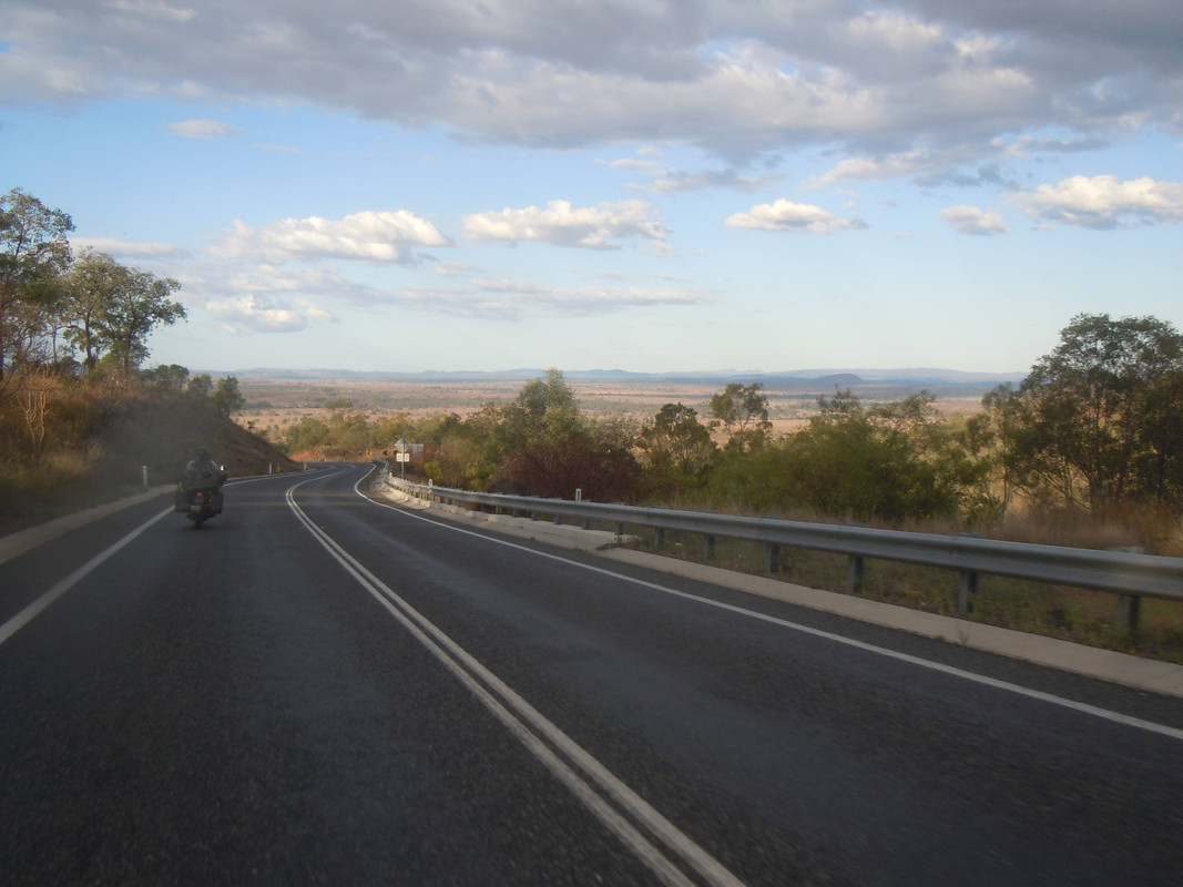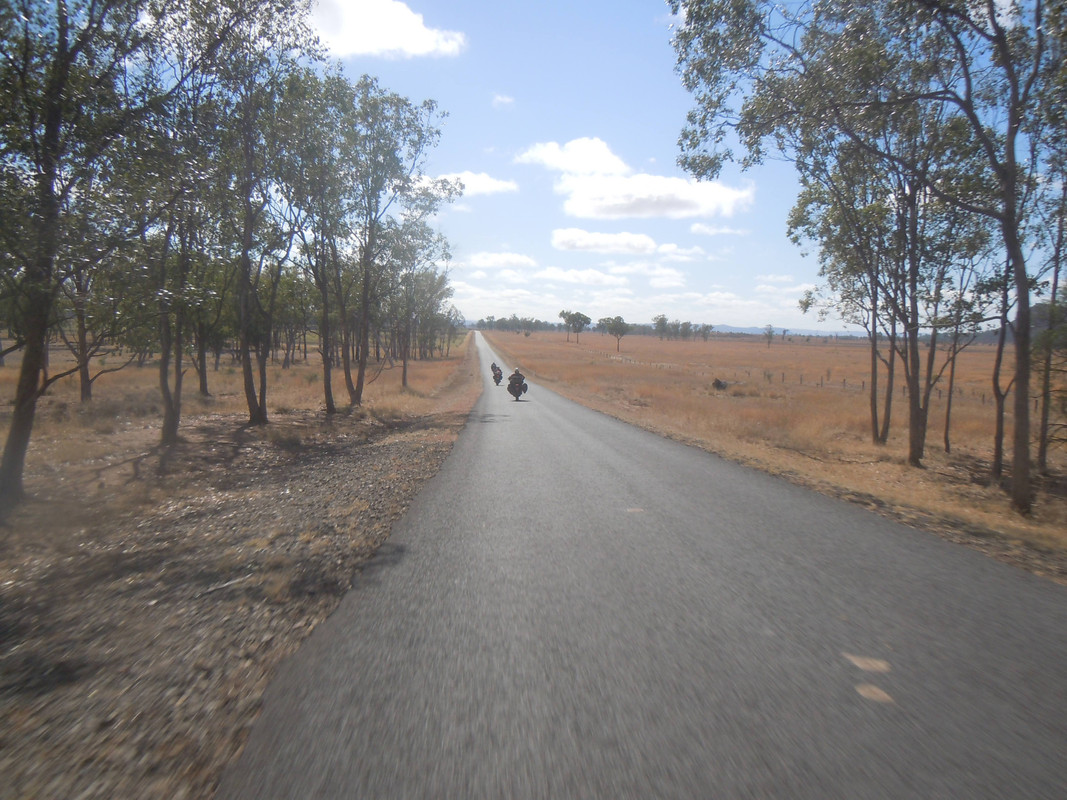 It was an uneventful trip except for a moment in Biloela. Our route require a right turn at a set of traffic lights. Realising KLR_Al hadn't realised the need to turn, I passed her quickly and then came to a stop as the right turn light was red. Moments later, KLR_Al passed me to the left and turned right aiming directly for the place where the side of the car proceeding through the lights would be when she got there. There was a moment when I was sure it was going to be an almost perfect T-bone with all the attendant grief that would go with it. Miraculously she missed the car by millimetres. Did the driver see her and speed up? Was she going more slowly than I judged? I'll never know, but she missed it and, unharmed (bar my shattered nerves) we chugged along happily for the rest of the day.