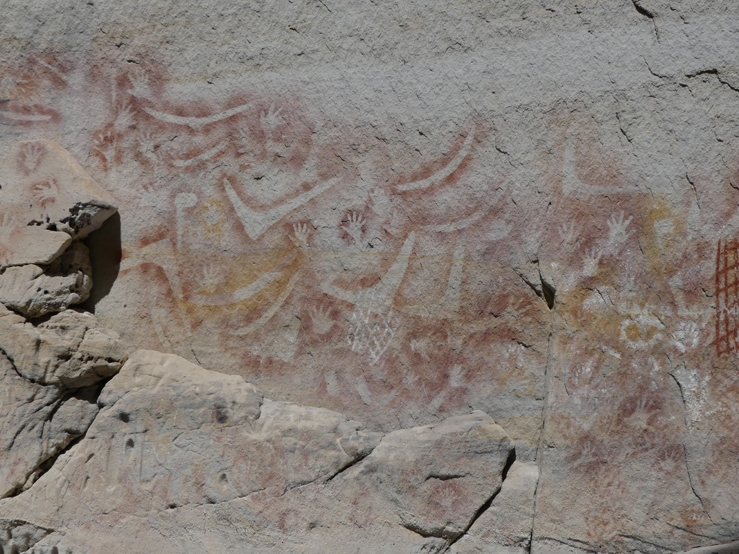 Australian indigenous art on the rock face in the Art Gallery. The colour comes from ochre and the images tell stories of the use of the site by Aboriginals.