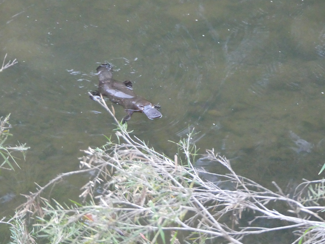 And later in the evening, a real treat. The river running past the campground is home to a platypus, shy and seldom seen. The platypus and four species of echidna are the only surviving monotremes on Planet Earth. Two monotreme sightings in two days is almost too good to believe. (See how I got all the variants of 'to' into the preceding sentence?) Anyway, campground residents take a drink and their camera to the waterhole around dusk to catch a glimpse of this peculiar creature. We were not disappointed.