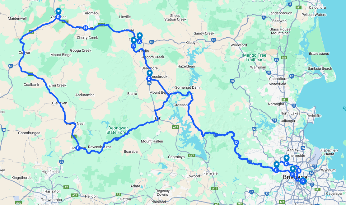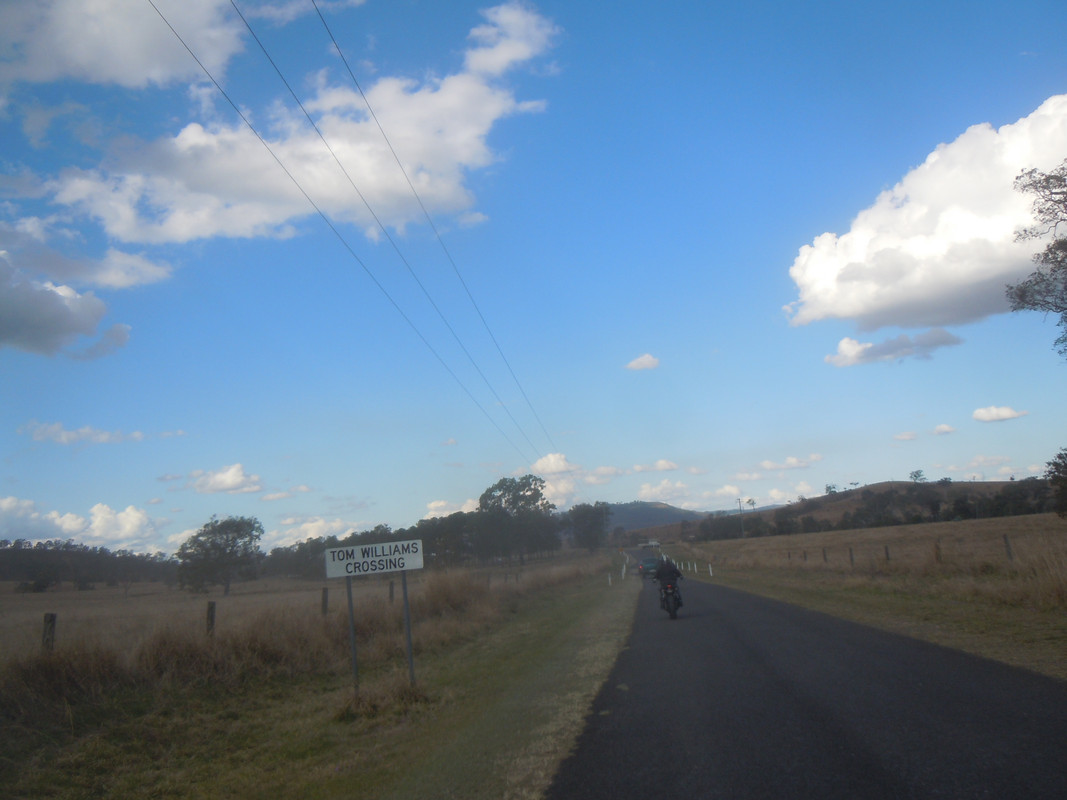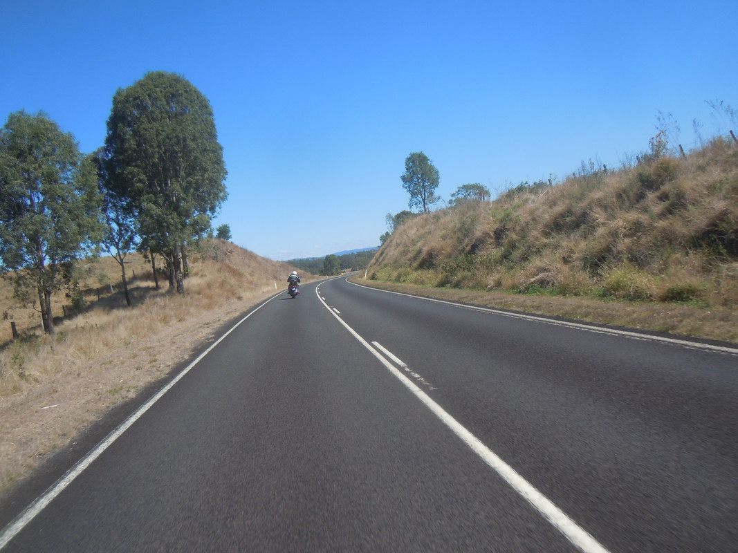 I had thought to ride home over Mt Mee, another great motorcycle road adjacent to Brisbane, as it would save us retracing our route. However, a couple of kilometres east of Colinton, we were stopped by heavy traffic and advice that there had been a nasty accident. We were welcome to proceed, but we would be turned around. That wasn't good news as I thought it meant we would have to retrace our steps to Hampton and Esk. Luckily though, near a service station at Colinton we spotted cars turning left onto a back road. A quick check of the map showed it would bring us out just south of the accident on the Brisbane Valley Highway. We could refuel at Toogoolawa and then head back over mounts Glorious and Nebo and be home before dark.
