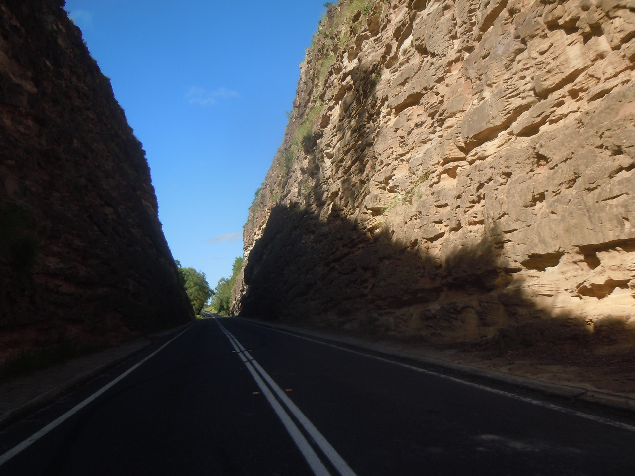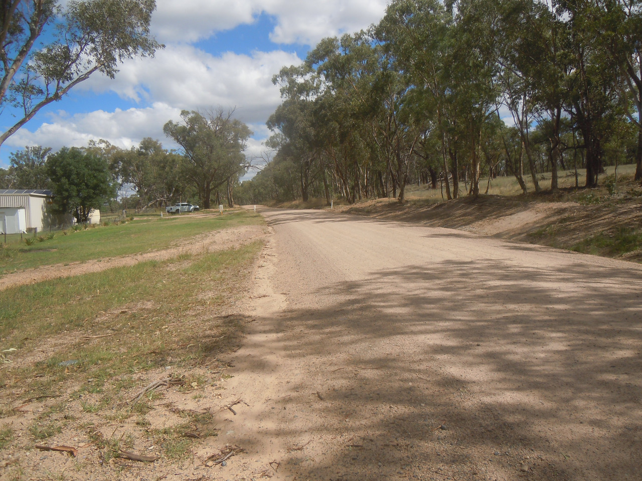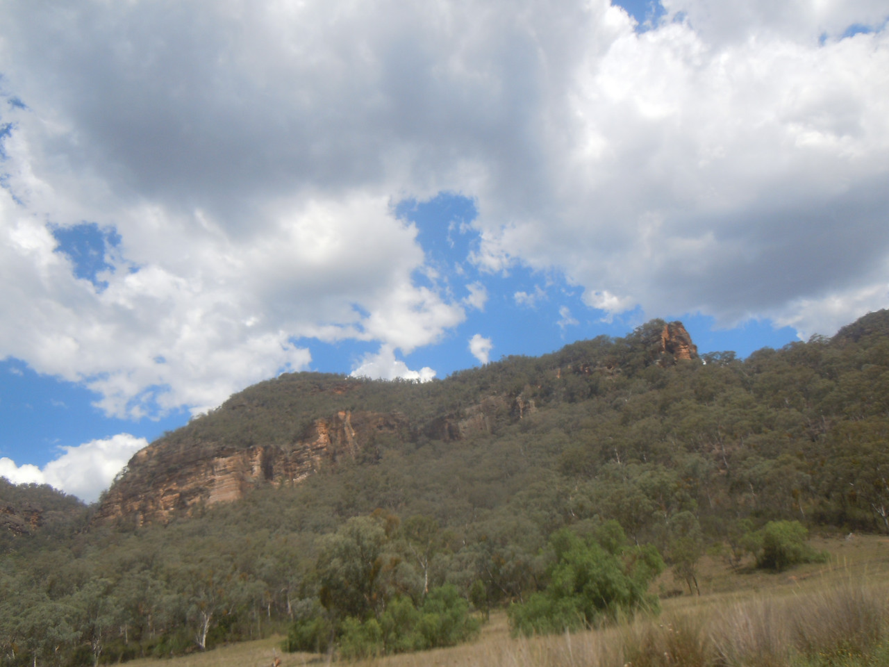 After joining it, the road runs past small escarpments, but one reasonably quickly arrives at a hill which offers an interesting climb with a couple of very tight corners, before one descends into a steepish, bushy valley for a couple of kilometres. There's a similar hill at the other end of the valley, so it always feels to me like I've arrived in a sort of secret valley protected on all sides by hills. It reminds me of a 19th century Australian novel, Robbery Under Arms where Captain Starlight's gang took their stolen horses to a lush hidden valley. I gather from the Wikipedia article that the valley is thought to be based on a sunken valley further north in the Gwydir region of NSW, another favourite riding area.