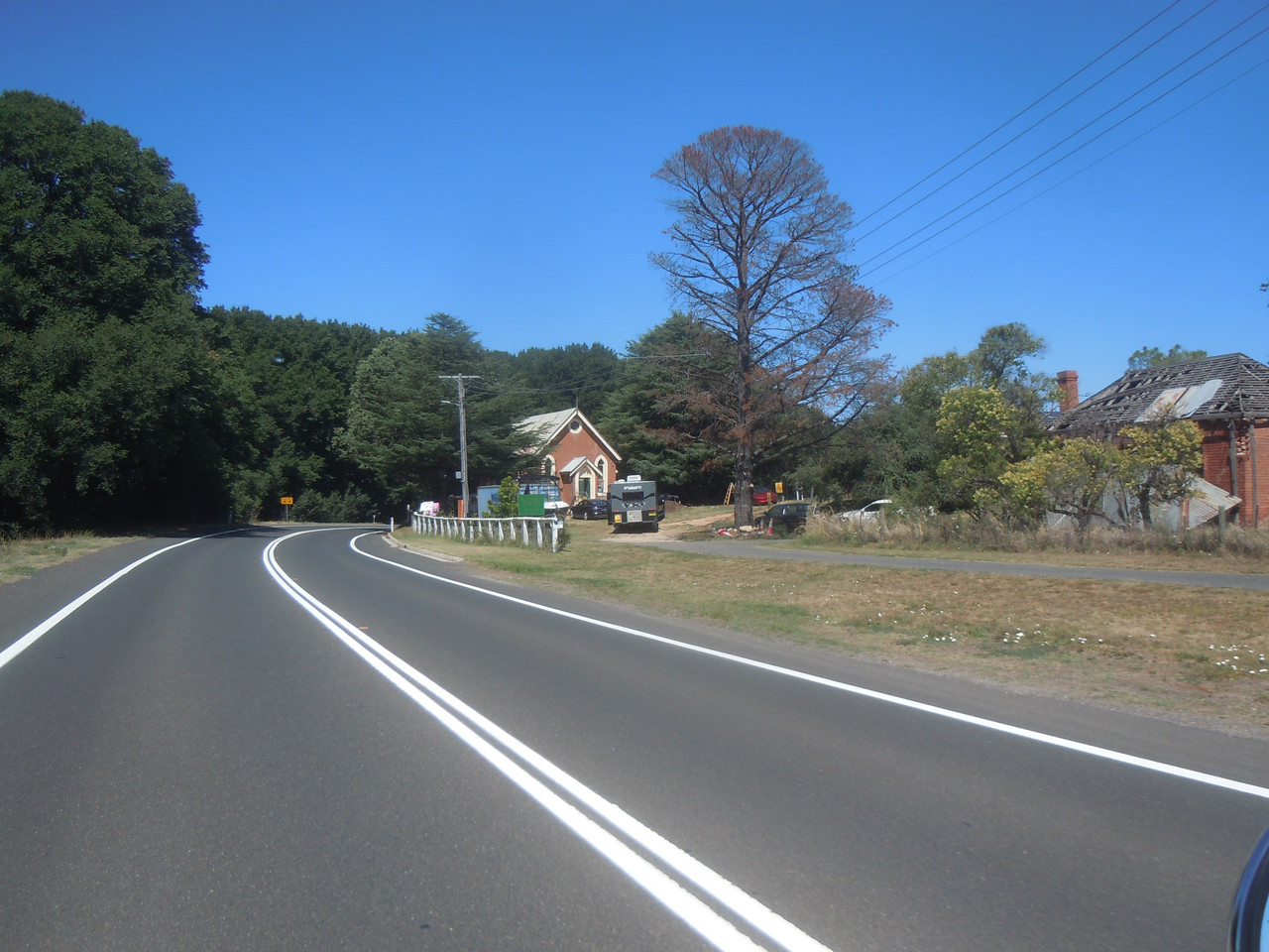I paused briefly at Jerrys Plains to drink lots of water — it had become hot — and to recalculate my route to get off the highway. There's a much more agreeable back road through Doyles Creek and Bureen which got me to Denman where I paused for water, coffee, food and petrol for the bike.